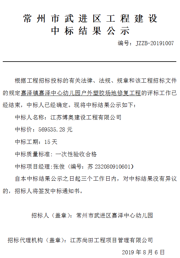 嘉澤鎮嘉澤中心幼兒園戶外塑膠場地修復工程中標結果公示